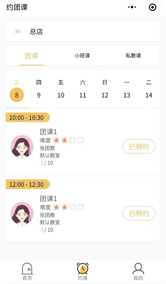 店面轮播图、场馆介绍链接、场馆照片墙链接、场馆金牌教练、活动消息通知。 团课约课、小班课约课、私教课约课。 我的课程、我的项目卡、我的预约课程、我的订单、我的消费记录。